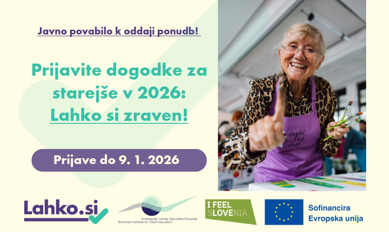 Na Andragoškem centru Slovenije v okviru projekta Ozaveščanje za vseživljenjsko učenje in kampanje Lahko.si vabimo organizatorje iz vse Slovenije k prijavi na javno povabilo za izvedbo dogodkov za starejše (65+) v letu 2026.