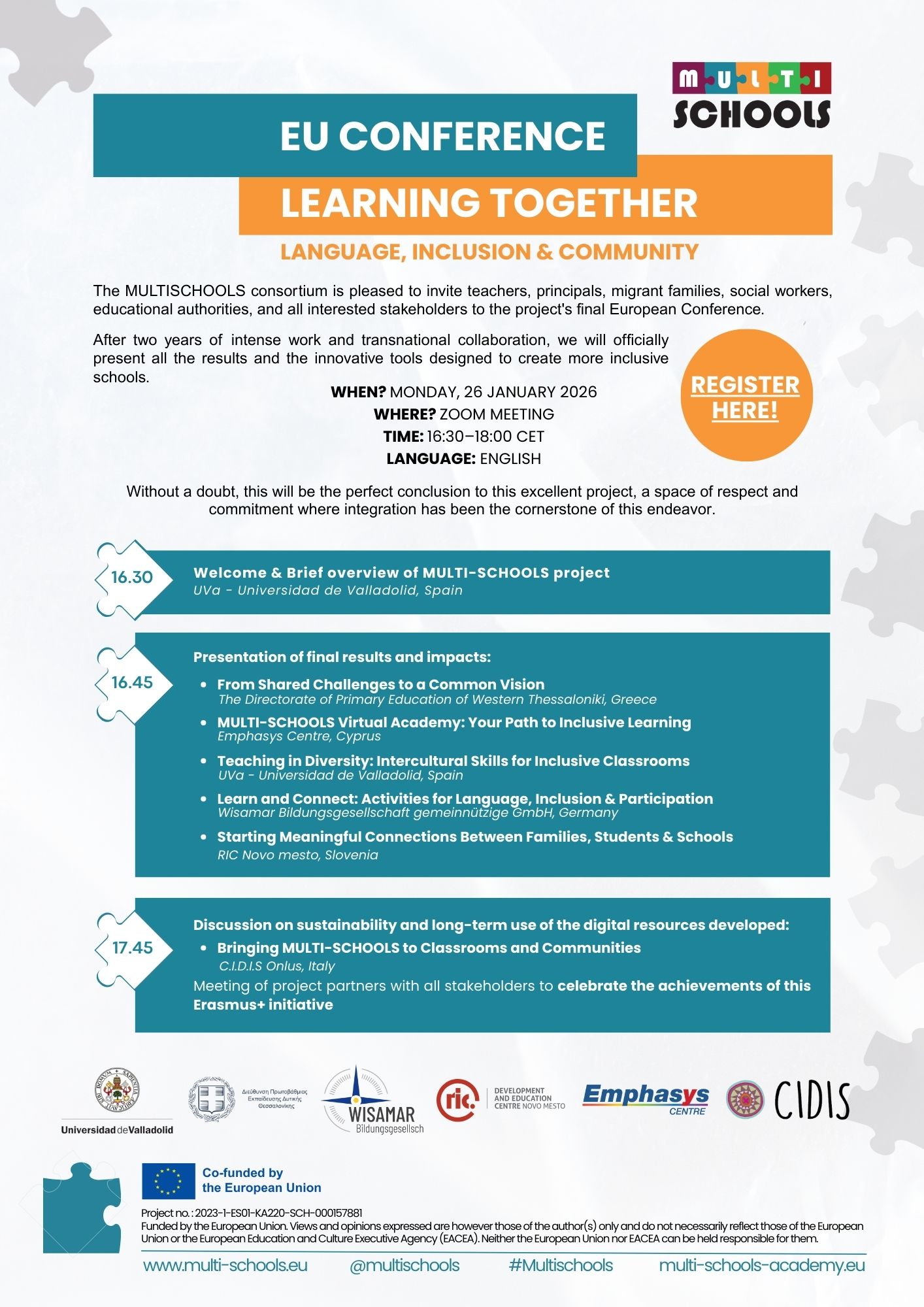 Po dveh letih intenzivnega dela in mednarodnega sodelovanja bomo predstavili rezultate projekta ter inovativna orodja za ustvarjanje bolj vključujočih šol. Dogodek bo priložnost za izmenjavo izkušenj in razpravo o priložnostih za nadaljnje sodelovanje.