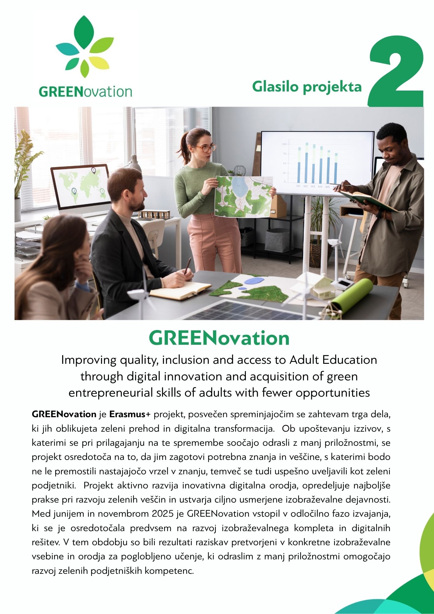 Projekt GREENovation, financiran v okviru programa Erasmus+, uspešno nadaljuje z razvojem inovativnih rešitev za izboljšanje izobraževanja odraslih, zlasti tistih z manj priložnostmi. Njegov glavni cilj je okrepiti zelene podjetniške kompetence ter olajšati prilagajanje na zahteve zelenega prehoda in digitalne transformacije.