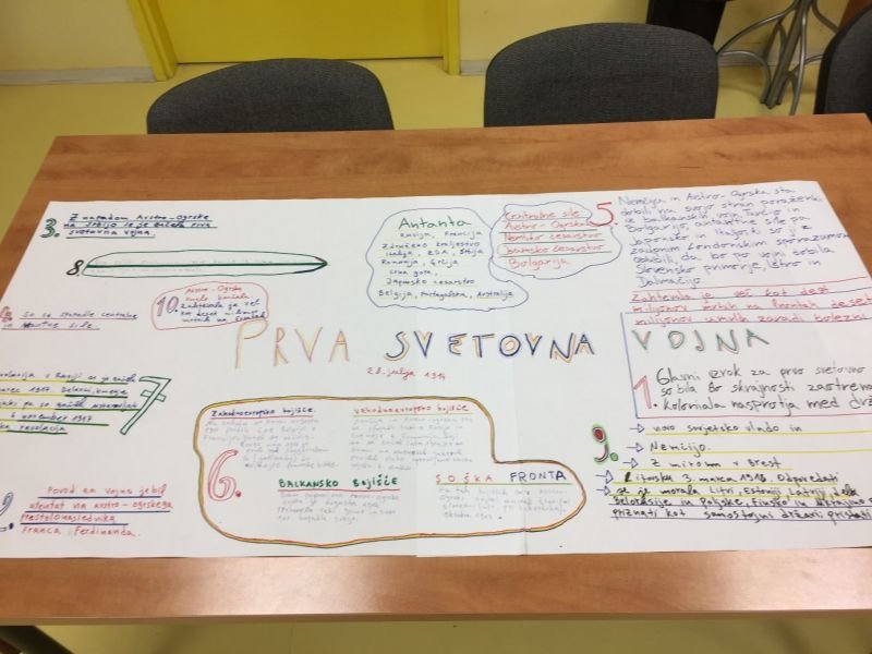 Učenje zgodovine zna biti naporno, saj se lahko hitro izgubimo v veliki količini besedil in informacij. Udeleženci skupine 5 so pri obravnavanju snovi o prvi svetovni vojni uporabili znanje, ki so ga pridobili pri slovenščini. Različne tehnike branja, so udeležencem pomagale pri iskanju in izločanju ključnih podatkov, ki so jih zapisovali na plakate.