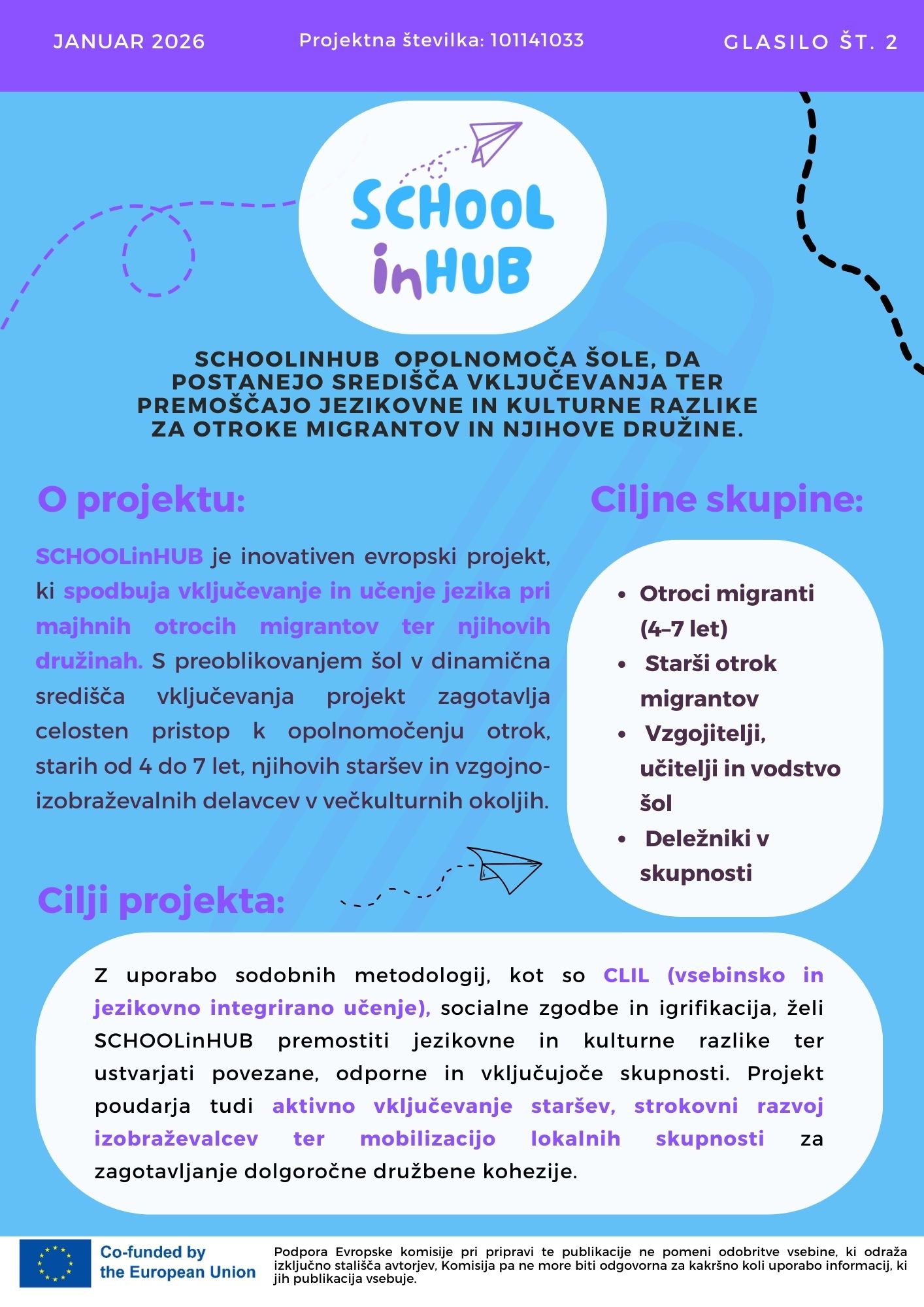Z veseljem sporočamo, da je izšla druga izdaja glasila projekta SCHOOLinHUB, ki prinaša pregled najnovejših aktivnosti, dosežkov in prihodnjih korakov projekta. Glasilo ponuja vpogled v prizadevanja partnerjev za ustvarjanje bolj vključujočega in podpornega šolskega okolja za otroke migrante ter njihove družine.
