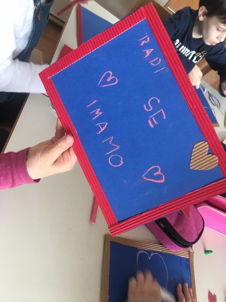 Glavno sporočilo delavnice je bilo: IMAMO SE RADI. Učili so se ročnih spretnosti, saj so izrezovali papir in blago, lepili, šivali, vezali ipd. Poleg tega so na prijeten način razvijali veščine spoštovanja in sodelovalnega učenja.